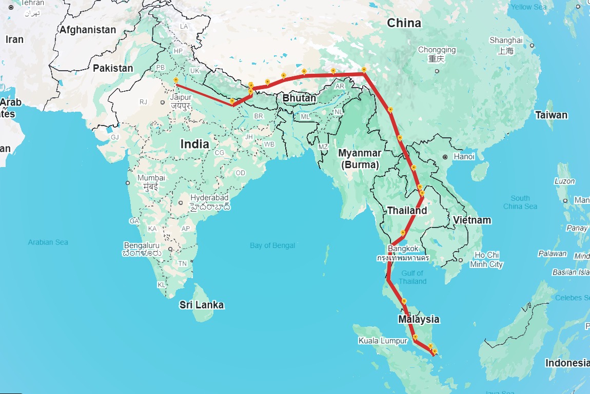 India → Nepal → China → Laos → Thailand → Malaysia → Singapore